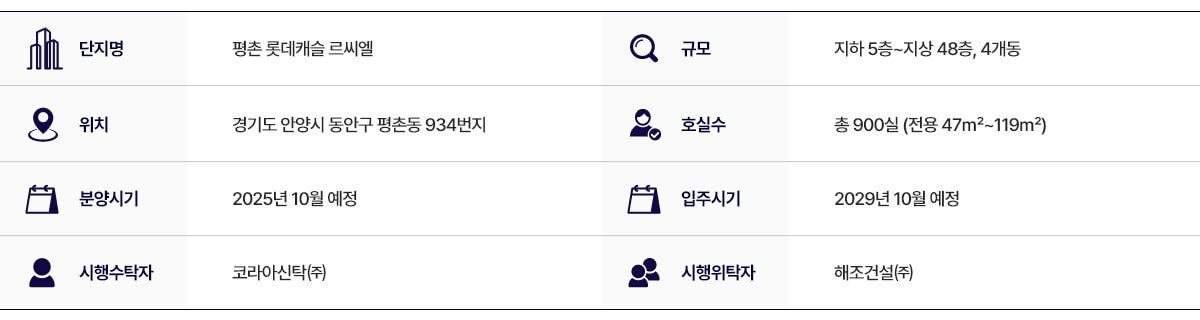 평촌역 역세권 오피스텔 평촌롯데캐슬르씨엘은 지상 최대 48층, 4개동, 총 900가구 규모이며, 전용면적 47㎡ 80가구, 84㎡ 300가구, 96㎡ 30가구, 118㎡ 230가구, 119㎡ 258가구로 구성됩니다.
